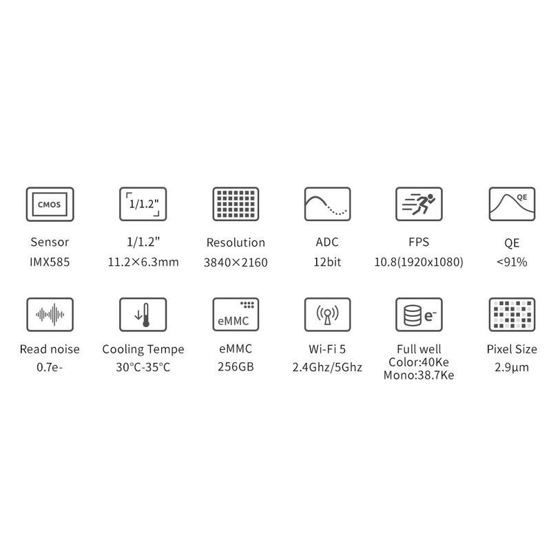 Η ZWO ASI585MM Air συνδυάζει καθοδήγηση, απεικόνιση και έξυπνο έλεγχο σε μία ενιαία και ελαφριά συσκευή. Πείτε αντίο στις σύνθετες ρυθμίσεις και απολαύστε μια απρόσκοπτη, απροβλημάτιστη εμπειρία αστροφωτογραφίας. Η κάμερα αυτή συνδυάζει αισθητήρες απεικόνισης και καθοδήγησης μέσα στο ίδιο σώμα. Ο κύριος αισθητήρας είναι ο SONY IMX585 με 12-bit ADC, μέγεθος 11.2x6.3 (mm) και τετράγωνα pixel 2.9 μm. Ο θόρυβος ανάγνωσης είναι εξαιρετικά χαμηλός (0.6 e) και το full well capacity φτάνει στο επίπεδο των 40 ke. Επίσης δεν υπάρχει λάμψη ενισχυτή.