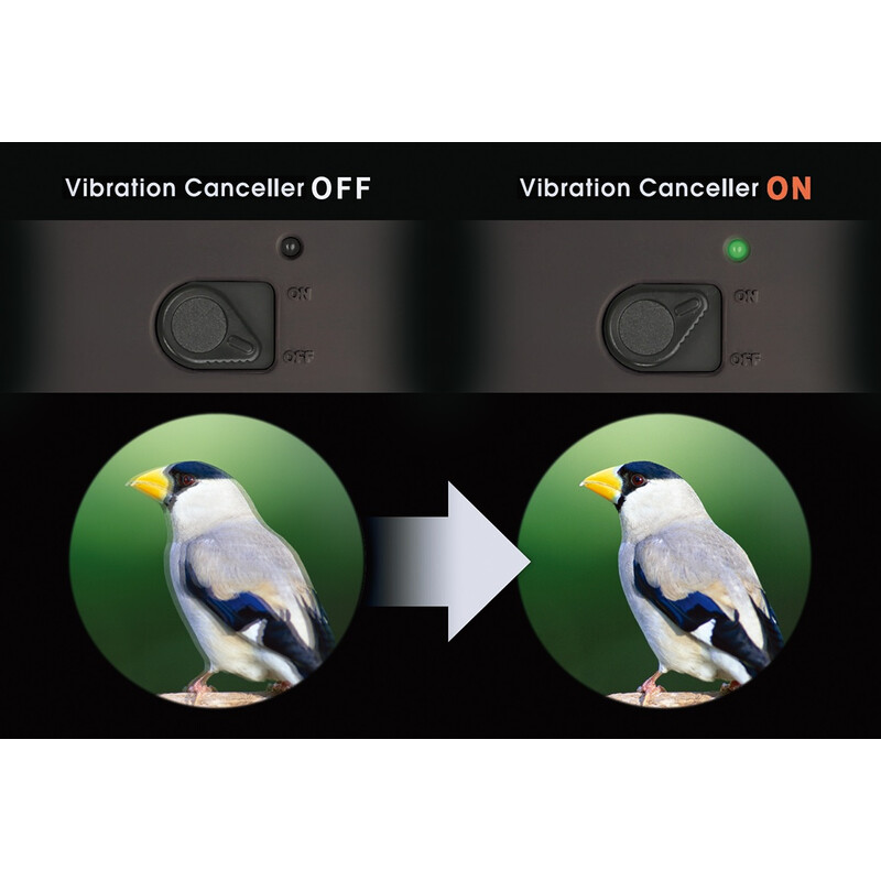 Τα κιάλια είναι εξοπλισμένα με δύο λειτουργίες κατά των κραδασμών, οι οποίες μπορούν να επιλεγούν ανάλογα με τα αντικείμενα παρατήρησης. Λειτουργία V1: Απορροφά μικρές δονήσεις κατά την κίνηση. (Αυτή η λειτουργία είναι προτιμότερη για χρήση όταν θέλετε να παρατηρήσετε ένα κινούμενο αντικείμενο.) Λειτουργία V2: Απορροφά μεγάλες δονήσεις σε αργή κίνηση. (Αυτή η λειτουργία είναι προτιμότερη για χρήση όταν θέλετε να παρατηρήσετε ένα στατικό αντικείμενο ή όταν κινείται πολύ αργά).