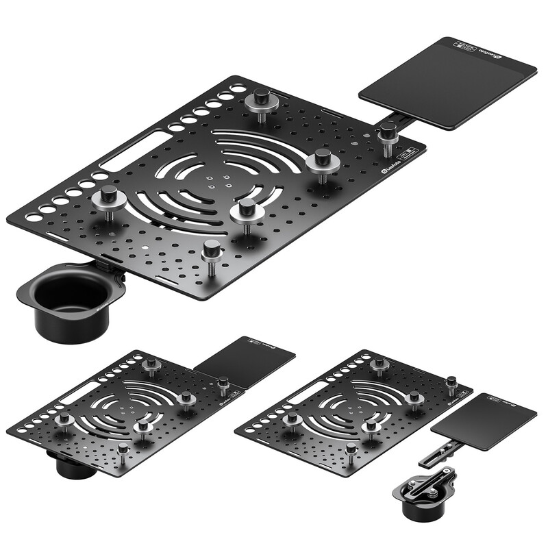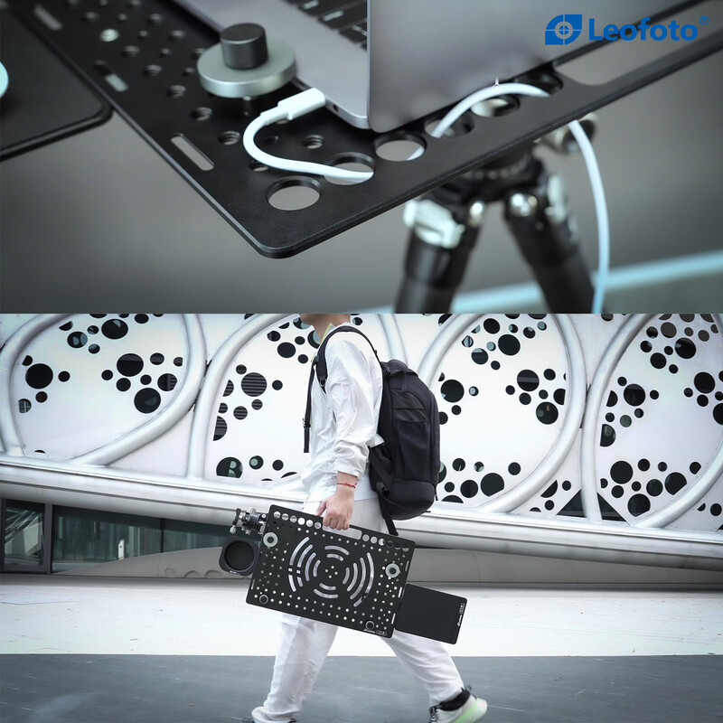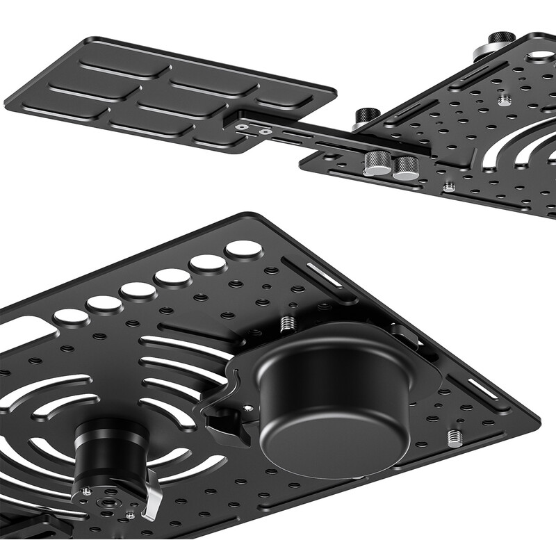 Μετατρέψτε το τρίποδό σας σε «σταθμό εργασίας επί τόπου»! Με διαστάσεις 460 mm x 310 mm προσφέρει επαρκή χώρο ακόμη και για φορητούς υπολογιστές με μεγάλες οθόνες. Η πλάκα αλουμινίου πάχους 5 mm παρέχει εξαιρετική σταθερότητα και μικρό βάρος. Οι 4 βίδες σύσφιξης μπορούν να τοποθετηθούν οπουδήποτε και οι επιφάνειες σύσφιξης είναι καλυμμένες με μαλακό υλικό σιλικόνης για να προστατεύουν τον πολύτιμο εξοπλισμό σας από ζημιές και να τον κρατούν σταθερά στη θέση του. Οι πολλές μικρότερες οπές και η μεγάλη κεντρική οπή στο επάνω μέρος επιτρέπουν τη βέλτιστη διαχείριση των καλωδίων και διευκόλυνση στη μεταφορά.