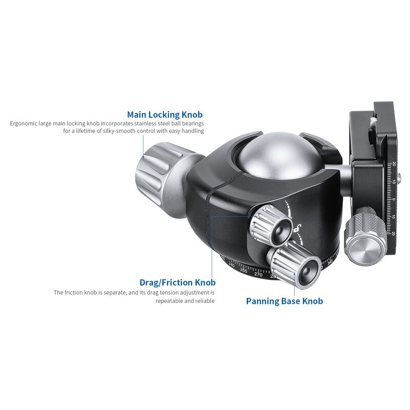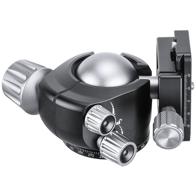 Η σφαιρική κεφαλή είναι εξοπλισμένη με στάνταρ σφιγκτήρα Arca-Swiss και μια πλάκα γρήγορης απελευθέρωσης.