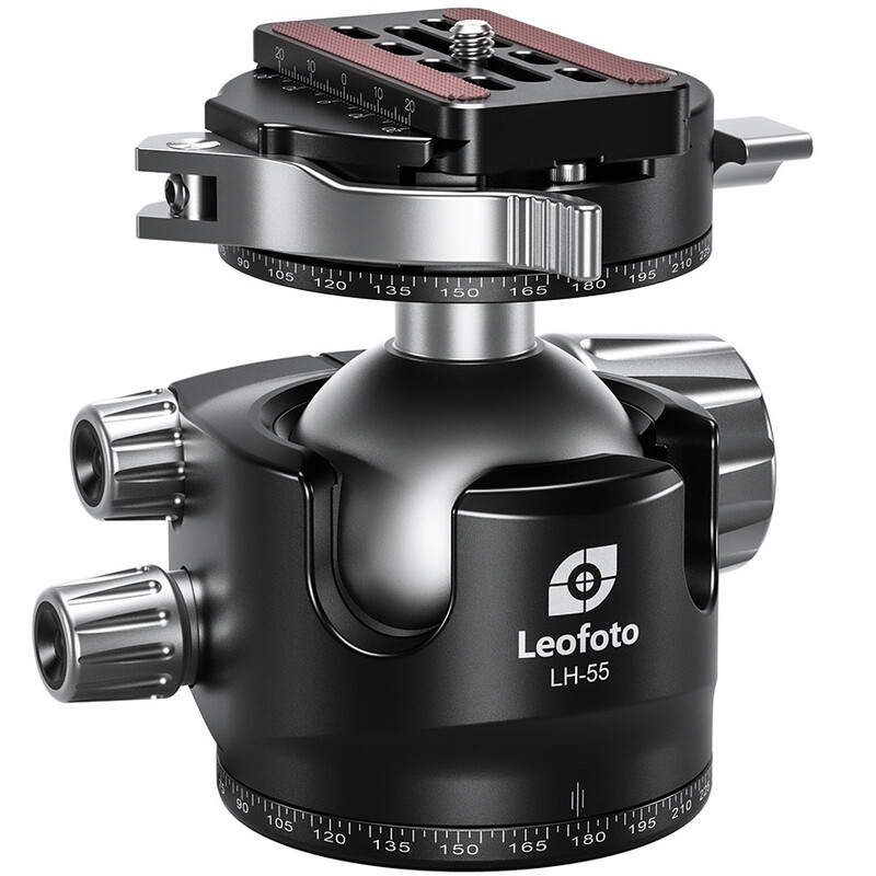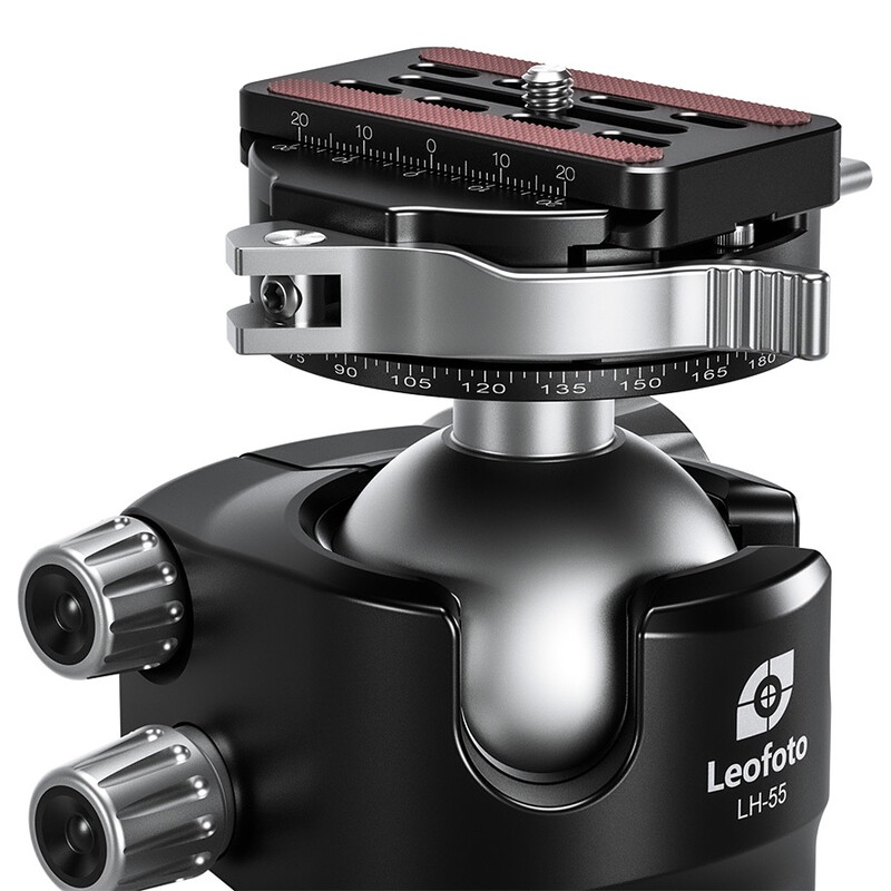 Leofoto σφαιρική κεφαλή LH-55PCL με πανοραμική πλάκα και σύνδεσμο γρήγορης απελευθέρωσης.